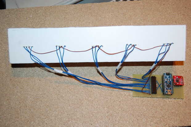 Una vez terminada la estructura de cartón pluma, fije los LEDs RGB en el interior del marco empujándolos a través el foamboard. Puede hacer pequeñas incisiones para ayudar a conseguir las piernas aunque. En el exterior, conecte los cables a los LEDs de la derecha. Tenga en cuenta que conectar los cables a la pierna derecha (R, G o B). Funciona probablemente mejor si se utilizan diferentes colores de hilos para las piernas diferentes (en forma de RGBRGB..) en el último paso. Doblar las piernas hacia el foamboard y utilizar alguna cinta (adhesiva) para evitar que las piernas tocar más tarde en el circuito.