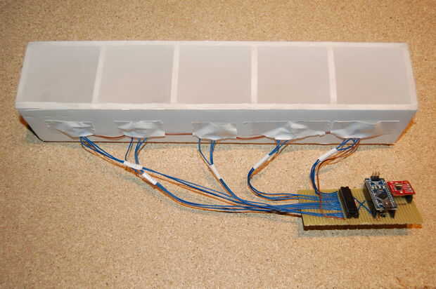 Ahora recorta dos pedazos de papel de aluminio mate que caben en los dos lados abiertos de la fila del cubo y pegar en los bordes de la estructura de cartón pluma. Puede ser prudente esperar con el segundo hasta que se prueba el software; de lo contrario será difícil de reemplazar o ajustar los LEDs si es necesario.
