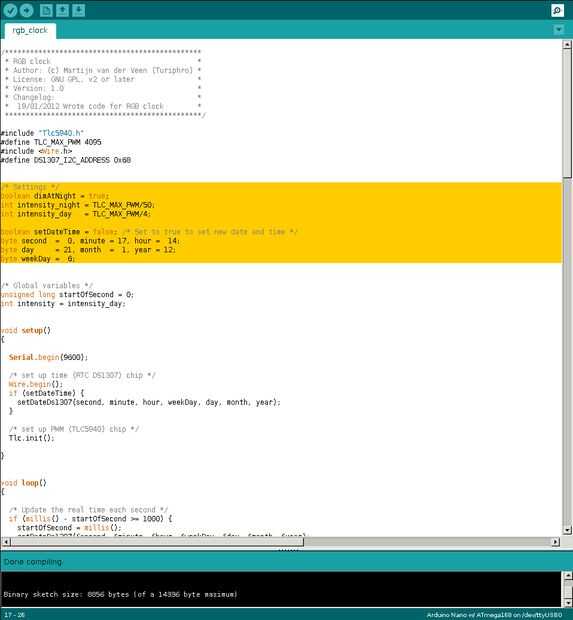 Para ajustar la hora en el módulo RTC, conjunto setDateTime a true y ajustar la hora actual. No te olvides de desactivar otra vez el booleano y para subir esa versión luego, de lo contrario el tiempo se establecerá cada vez que se inicia el Arduino.