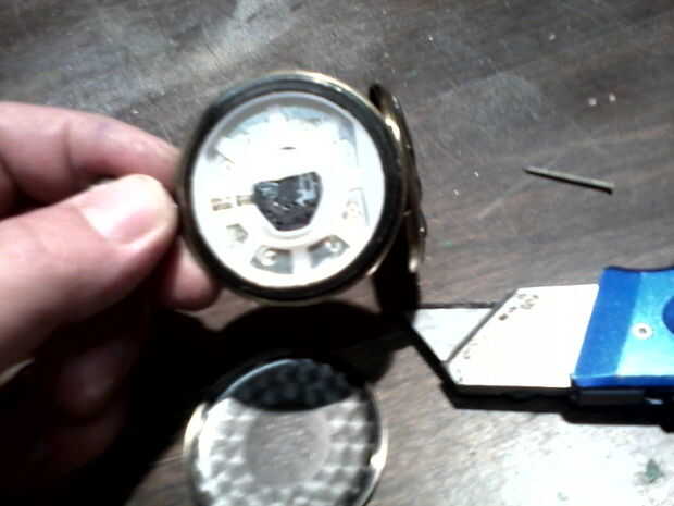 Primero tienes que sacar la cara y volver a sacar la cara hay dos formas de hacer tan uno podrían gire la bisagra o podría retirar empujando una aguja o un perno en la bisagra pequeña y la fuerza hacia fuera. Para quitar la parte de atrás use un cuchillo fino y pop abierto. el orden en que haces esto es a elección.