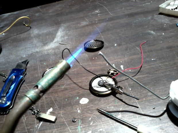soldar o pegar los cables a los terminales positivo y negativo. no yo no uso actuly la antorcha de propano utilicé soldadura para conectar cables de pegamento caliente funciona así
