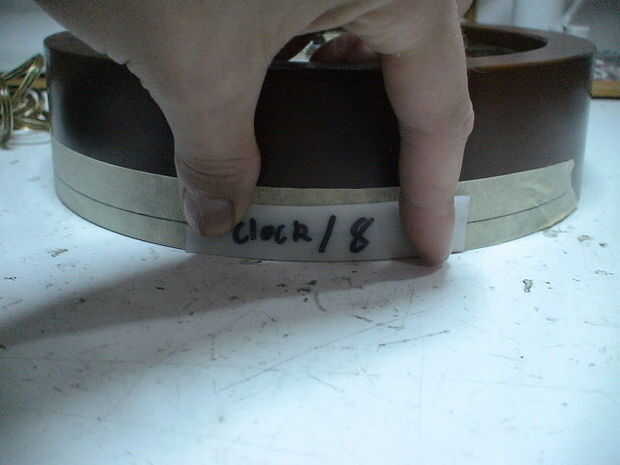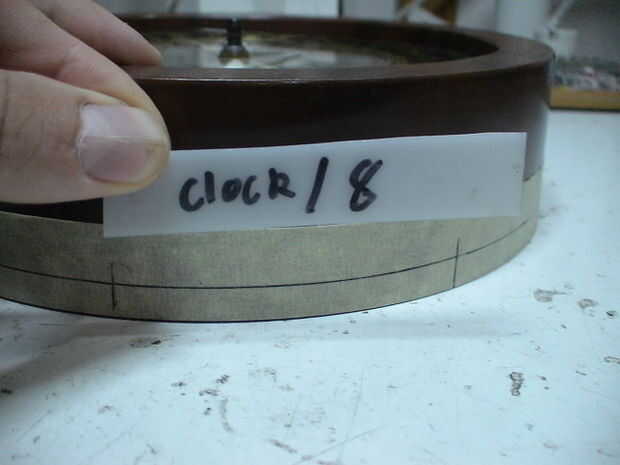 Primero fuera del orificio necesitan posiciones marcadas. El diámetro de relojes fue 9,25" por lo que su circunferencia era de 29". Puesto que quería 8 LED ' s, espaciados los agujeros 3,65" aparte. Corté un pedazo flexible de plástico para usar como regla.