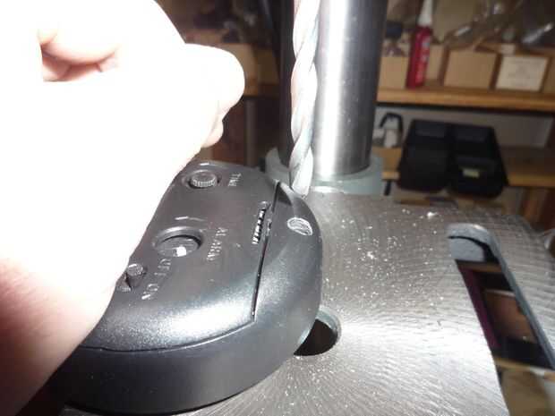 Dependiendo de la alarma que elijas para el proyecto, generalmente habrá un set de tornillos en la parte posterior del reloj que sujetan el reloj.  ¡ Elegir una de estas ubicaciones de los tornillos para la colocación del perno de montaje que se coloque el reloj para el montaje del manillar.  Retire el tornillo y perfore un agujero completamente el reloj.  Usé una broca #7 de mi índice de taladro que es de aproximadamente.2 pulgadas de diámetro que es ligeramente más grande que el tornillo de montaje que he usado.