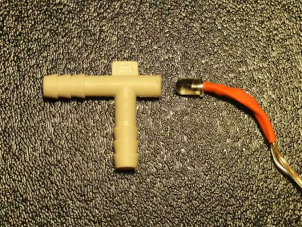 Para crear una boquilla iluminada empecé con una conexión "T" de manguera de aspiración, disponible en la mayoría auto proveedores. Corte el extremo, dejando suficiente espacio para que el LED no bloquearía el flujo de agua. La apertura necesaria para taladrar ligeramente para dar cabida a una de 5mm, LED de alto brillo. Hacer el agujero del tamaño adecuado permite un sello apretado del agua sin el uso de pegamento.