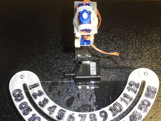 Luego añadí dos placas de plástico - una placa base que sostiene la bomba y una placa de número de la fuente a corriente en. Para difundir la luz alrededor de los números, he utilizado un plástico opalescente. Había grabado cuidadosamente los números en él, pero no eran muy visibles. Así trazó sobre ellos con un marcador permanente. Una vez más, uno podría hacer una versión más bonita...