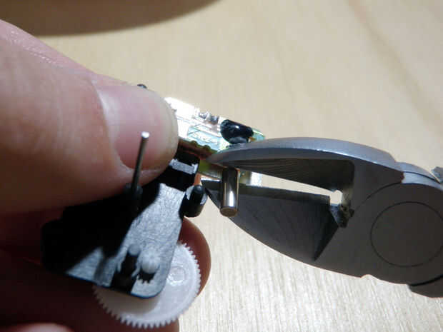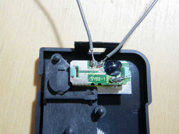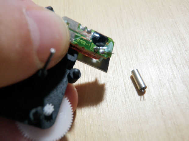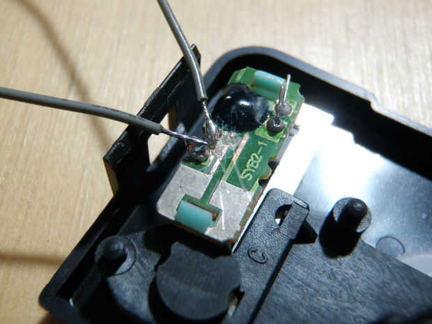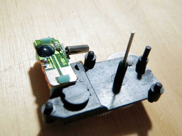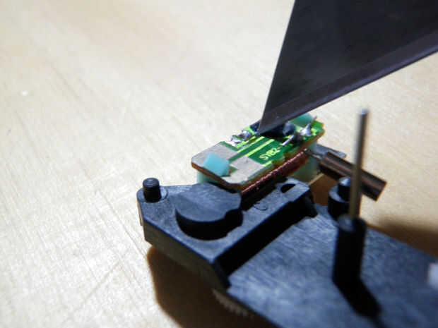 Localizar los contactos en el circuito donde se encuentra el motor. Observe estos dos contactos tienen rastros que se van a la viruta (oculta bajo la gota negra). La idea es utilizar una hoja de afeitar o un cuchillo a cero lejos en estos rastros hasta la conexión con la viruta se rompe visiblemente.