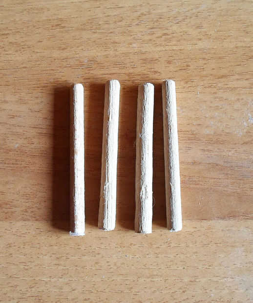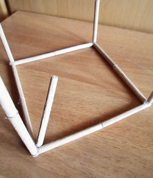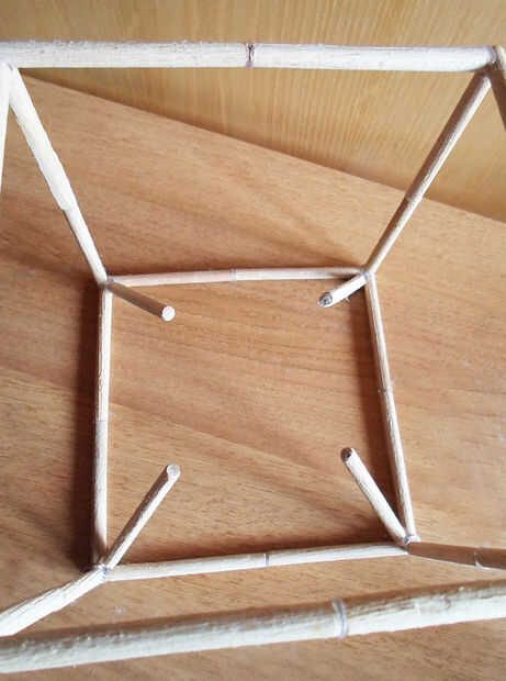 Tomar el cuadrado de cartón que solo preparada y siempre usando pegamento caliente, pegar entre las 4 clavijas.