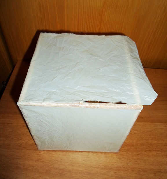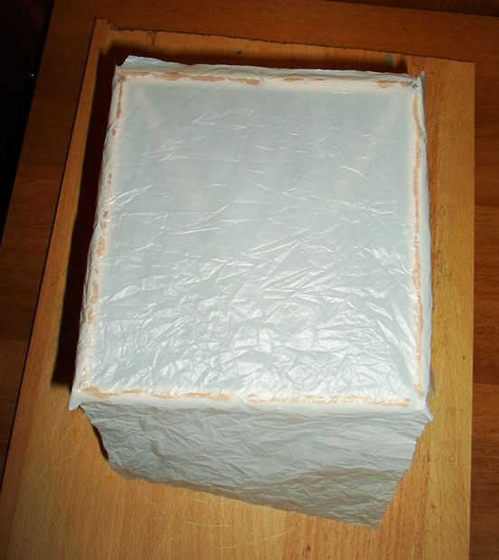 Ahora puede finalmente la plaza superior a la parte superior del cubo del pegamento y no se olvide de pegar el borde final en el interior también. Si los 2 lados opuestos de la misma son demasiado grandes, usted puede siempre cortarlos un poco para que no van sobre el otro plástico.