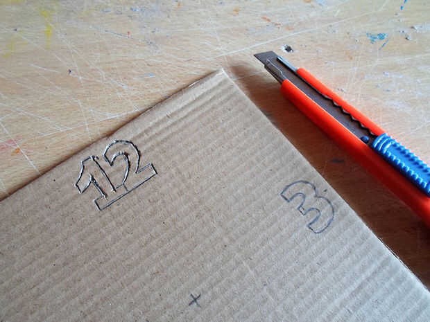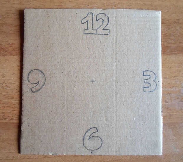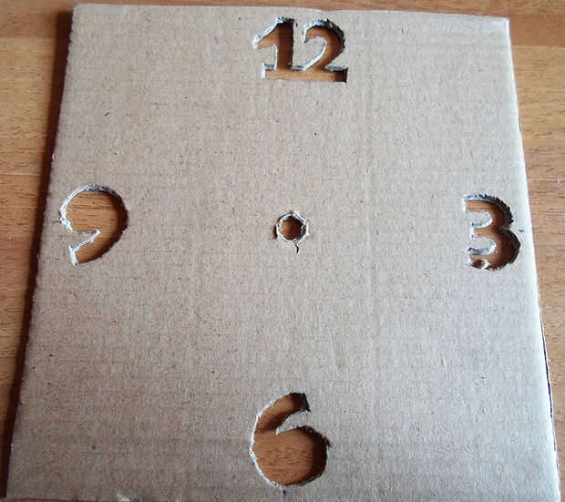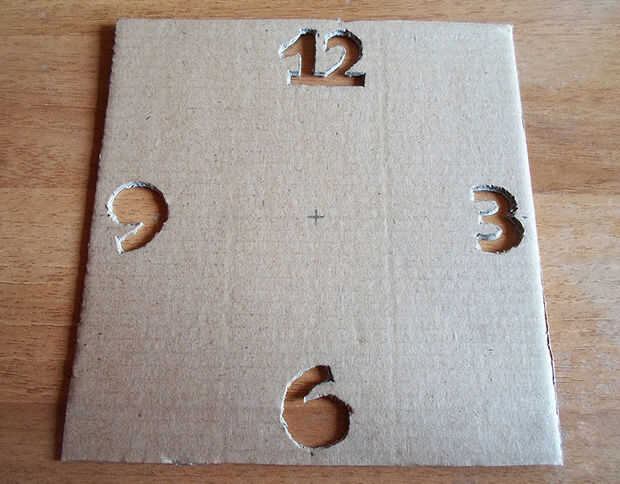 Dibujar los números 3, 6, 9 y 12 en el centro de los lados, como puede ver en la imagen y recorto muy cuidadosamente usando un cortador.