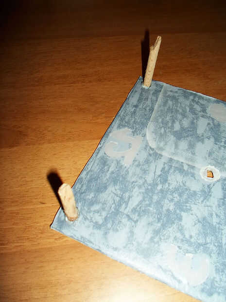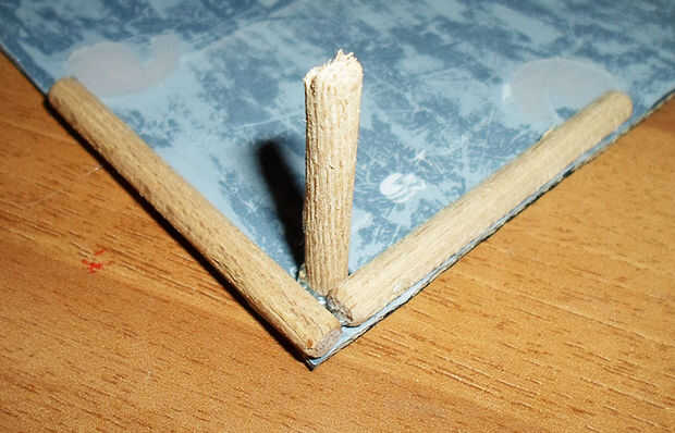Tomar uno y pegar una de sus puntas detrás de la parte superior del reloj, pero asegúrese de dejar un marco fino gratis. Usé 2 clavijas como guías, como se puede ver en la imagen. De esta manera la espiga no vence la estructura del cubo.