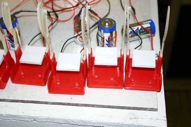 Con resina, pegamento de las células Peltier a la base del pájaro.