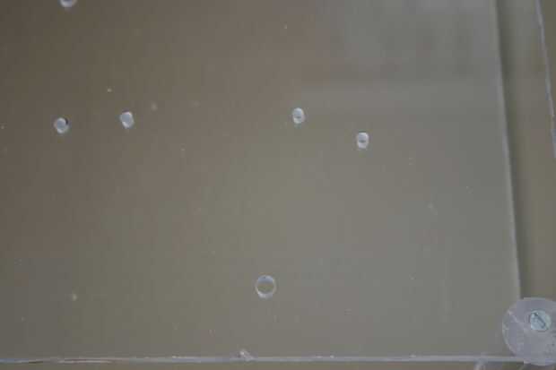 En la placa superior de acrílico, perfore un agujero detrás del base pájaro (cerca de 1 pulgada detrás de la base) lo suficientemente grande para meter dos cables Peltier (y empalmes de la soldadura) a través.