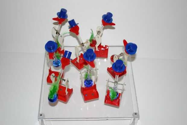 Como preparar cada base, inserte el cuerpo del pájaro y bob en toda su extensión de ambas direcciones.  Asegúrese de que las aves no chocarán antes de taladrar los agujeros.