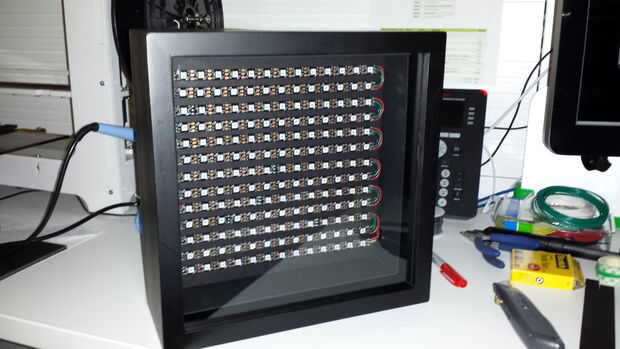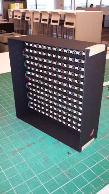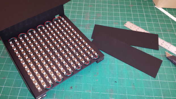 Una vez tengas el código y base de trabajo, es hora de empezar a construir la caja de reloj. La base del reloj de palabra está construida principalmente con tablero de base de espuma y cinta de doble cara. A partir de la parte posterior de la Junta donde se montan sus tiras de LED, añadir unas tiras en la parte superior e inferior. Si usas el mismo 10 x 10 shadowbox, utilice cuatro 9 1/4 de pulgada por 1 pulgada las tiras para la parte superior y otro cuatro para la parte inferior. Esto crea un área detrás de la rejilla para montar el tablero de Arduino y proyecto que contiene el RTC.