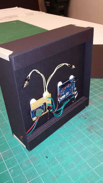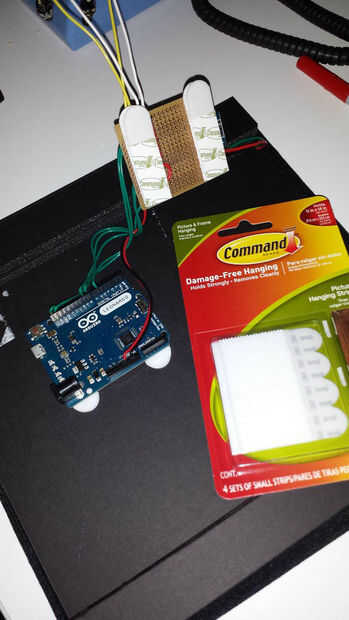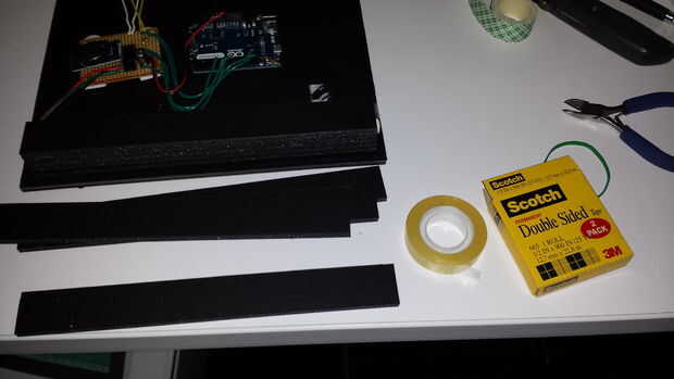 Los componentes electrónicos se unen utilizando las tiras de Velcro comando. Esto le permite desmontar los componentes, si es necesario. Se puede ver en la foto de arriba donde los tres cables de la tira LED envuelven a la parte posterior. Corte un agujero en el tablero de lado para evitar que el lado de la inclinación.