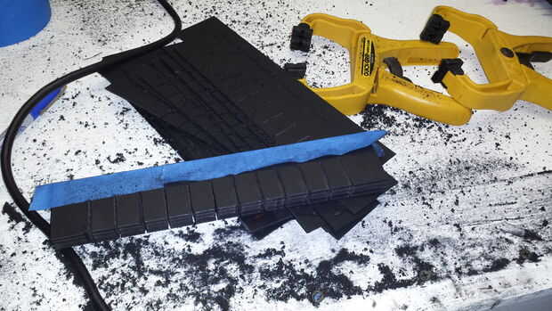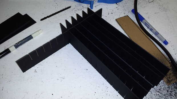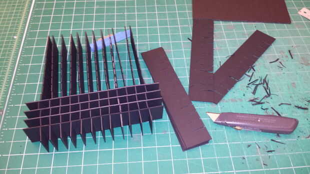 Si no tienes acceso a una impresora 3D, usted puede recortar los deflectores. Asegúrese de cortar los listones ligeramente mayor que el espesor del material que está utilizando. Para la primera iteración de bafles, hemos utilizado una cartulina gruesa, que luego amontonados y cortar con una sierra de calar. Fue desordenado, sin dejar de mencionar un poco peligroso. Soy un poco parcial a mis dedos.
