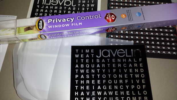 He probado unos cuantos estilos de capas diferentes para reducir el sangrado leve y buena difusión de la luz. El resultado fue a cortar la red de la carta de vinilo en revers. Aplique el vinilo en el plexiglás. Luego agregue una sola hoja de película de privacidad sobre el vinilo. Una vez montado, las capas de reloj parecen a esta (delante hacia atrás):
