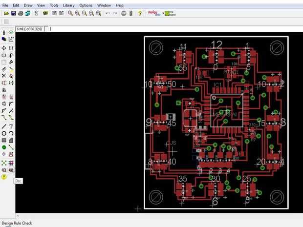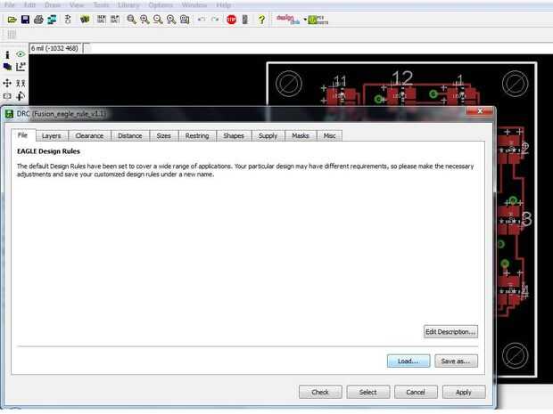 Una vez su en la carpeta desde la ventana de archivo de tabla, haga clic en el botón de verificación regla de diseño en la barra de herramientas. (su cerca el gran signo de exclamación amarillo) A continuación, haga clic en carga y abra el archivo que acaba de poner en esa carpeta. Este archivo tendrá todos los requisitos y reglas de diseño requeridas por la casa de la Junta a fin de que para la fabricación de la placa. Haga clic en comprobar para ver si la tabla cumple con todas las reglas. Si no es así, aparecerá una ventana diciendo lo que hay que cambiar.