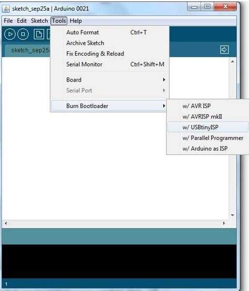 Luego vaya a herramientas -> Burn Bootloader -> y haga clic en el programador que está usando. Espere unos minutos y obtendrá un mensaje diciendo "hecho bootloarer"