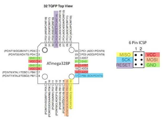Para programar vía ISP necesita conectarse a 6 pines en el chip AVR: (marque la hoja de datos para saber dónde están en el chip)