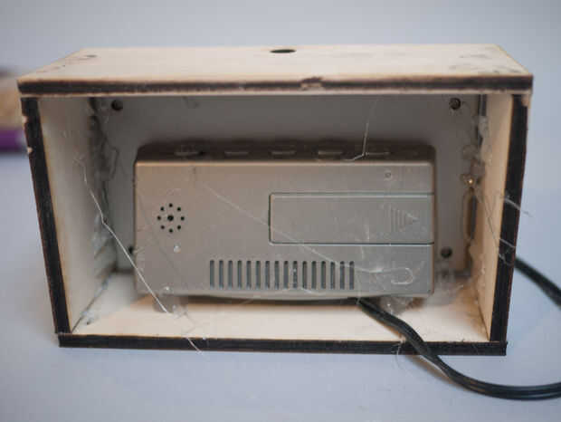 Colocar la caja en la parte delantera e introducir el reloj. Esto se asegurará de que cara del reloj esté al ras con la parte delantera de la caja. Vaya con la pistola de pegamento! Los resultados no son bonitos en la foto aquí, pero el reloj está sólidamente en consecuencia.