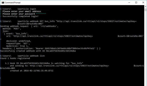 Webhooks escucha para eventos de los dispositivos. Cuando se envía un evento coincidente, el gancho de enviar una solicitud a la transitlink API y recuperar todos los detalles. Para obtener más información en webhooks, haga clic aquí: Webhooks de partículas.