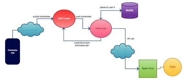 Una aplicación de node.js se ejecuta en un servidor ha "suscrito" a cada actualización para el usuario A, por lo que se informa de esta nueva posición. El servidor conoce las coordenadas geográficas de cada lugar posible para el usuario A: en casa, en el trabajo, etc.. Compara la posición actual a estos datos y concluye la ubicación del usuario. Luego hace una llamada a la API en la nube de chispa para el reloj cambiar en consecuencia.