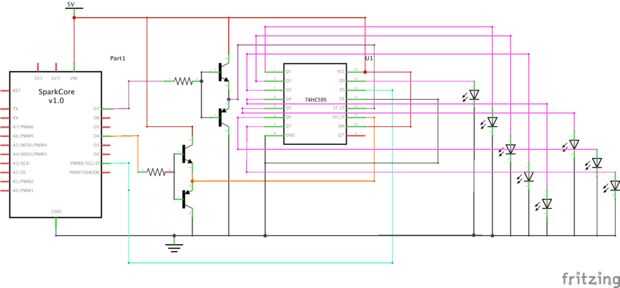 En primer lugar, contamos con cinco usuarios con doce posibles ubicaciones, que nos da 60 LEDs. Puesto que va a ser en sólo cinco LEDs al mismo tiempo, poder no debería ser un problema, pero todavía tenemos que abordar diferentes 60 salidas. Desde el núcleo de la chispa, coche que muchos LEDs, utilizaremos el registro de desplazamiento 74HC595, o más exactamente, ocho 74HC595 shift no registra (ya que cada uno puede controlar hasta 8 salidas).