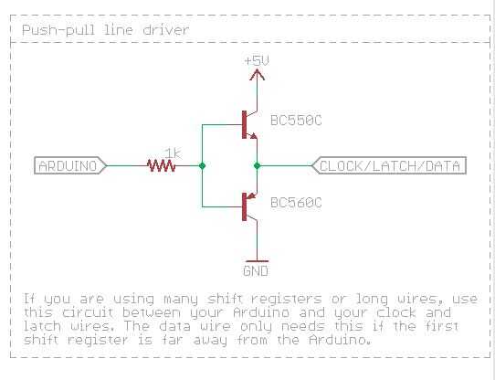 El otro pequeño giro es que ya que estamos ocho registros de cambio diversos conectadores, necesitamos utilizar un pequeño circuito para asegurar que la señal estará lo suficientemente fuerte como para cada registro de desplazamiento recogerlo: esto se llama un conductor de línea de vaivén (créditos a http://www.elcojacobs.com/ de los esquemas y para explicar esto en su página web, nos tomó semanas para averiguar)