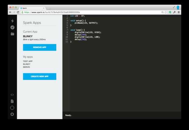 Ir a http://www.spark.io y siga las instrucciones para configurar su base por primera vez. Una vez que termines, debería poder acceder el IDE (captura de pantalla tomada de la Web de documentación de chispa)