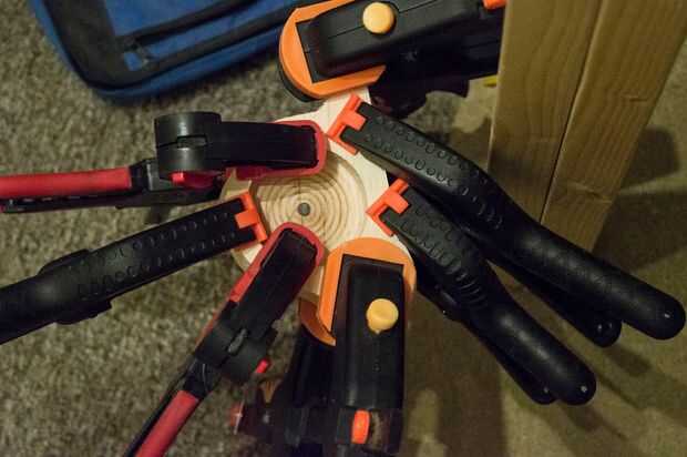 Limpie las superficies de madera de cualquier polvo, suciedad o aceite. Luego aplicar pegamento de madera de forma uniforme y pegan las dos mitades. Hasta el mejor puede y comenzar la sujeción con abrazaderas de tipo trinquete, estos son buenos para obtener la madera en la posición correcta antes de realmente el apretón! Utilicé 4 pinzas de carraca y luego llena cada espacio disponible con el resorte de pinzas de agarre. Deje secar durante la noche.