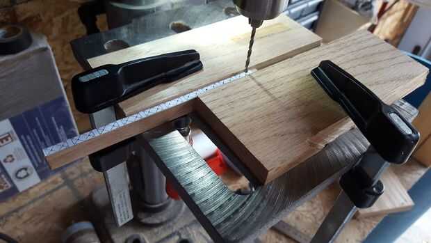 He pegado el plan en el lado de un bosque de roble de 1/4" y con abrazadera de dos piezas de madera para taladro para crear una plantilla.