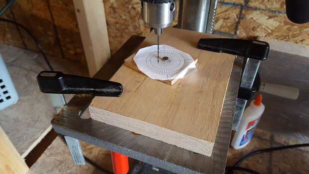 En primer lugar, perforé un agujero a través del centro de la pieza de madera iba a hacer un bisel de y luego atornillado en un tablón de madera para que mi pieza de bisel le gire sobre su centro y no deslizarse hacia los lados. Luego sujeta el tablón de madera do mi taladro, alineando mi primer orificio precisamente.