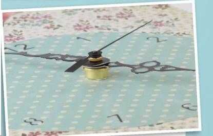 Las agujas del reloj se fijan el mecanismo en la parte posterior por un orificio en el centro del diseño. Como hacer caras para ocultar el mecanismo de su reloj, sólo medir y anotar una larga franja de Monte tarjeta para caber alrededor de él. Hazla única! Puede personalizar este diseño utilizando papeles estampados para decoración de su propia casa.