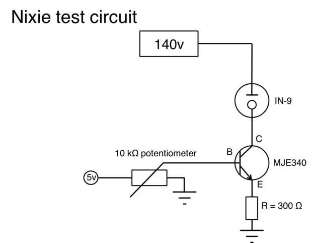 Antes de ir a todo camino que quiso poner a prueba a mis tubos de nixie, para ello he construido un circuito de prueba sencilla utilizando un tubo, transistor y potenciómetro 10 k tuve puesta alrededor. Como puede sido visto en la primera figura, la fuente de 140v se une al ánodo de tubo (pierna derecha). El cátodo (pierna izquierda) se conecta a la pata del colector del transistor MJE340. Una fuente de 5v se conecta a un bote k 10 divide a tierra en el base del transistor. Finalmente el emisor del transistor se conecta a través de un resistor limitador actual de 300 ohmios a tierra. Si no estás familiarizado con transistores y electrónica no importa, sólo alambre para arriba y cambiar la altura de plasma con la perilla de la olla!