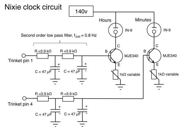 Este tutorial utiliza un controlador de baratija y un RTC para controlar dos amplificador analógico metros. Usando modulación de anchura de pulso (PWM) para controlar la deflexión de la aguja. La bobina el amperímetro es el PWM en una señal dc eficaz. Sin embargo si usamos el PWM directamente a los tubos entonces la modulación de alta frecuencia significa el la barra de plasma no permanece "fija" a la base del tubo y tendremos un bar flotando. Para evitar esto que promedió el PWM usando un filtro de paso bajo con una constante de tiempo para obtener una señal casi continua. Esto tiene un frecuencia de Hz 0,8 de corte, esto está bien, que estamos actualizando la hora del reloj sólo cada 5 segundos.