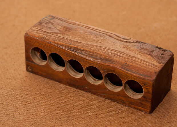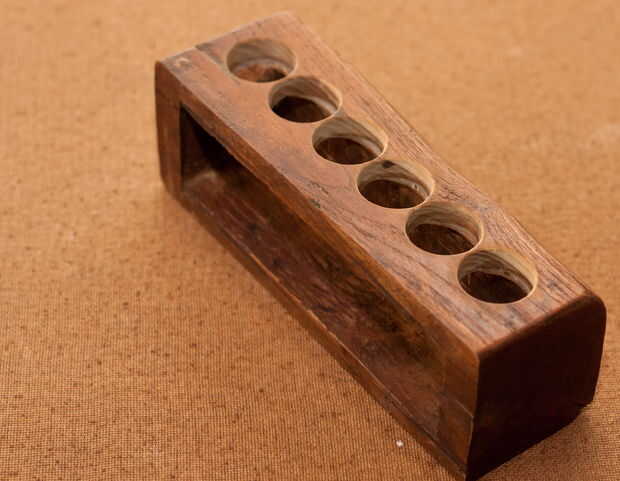 Para perforar los agujeros evitando madera grietas de formación, empujar un bloque de madera en el interior superficial de la Junta e intente mantener presionado con cuñas o mordazas, luego perfore los agujeros hasta llegar a él. Tratar de dejar al menos un par de milímetros de espacio entre los agujeros. Mi primer escudo era demasiado corto, y tuve que hacer un escudo más pequeño para que coincida con los orificios.