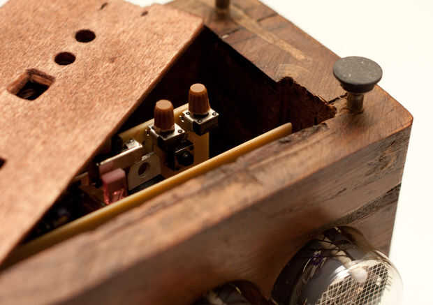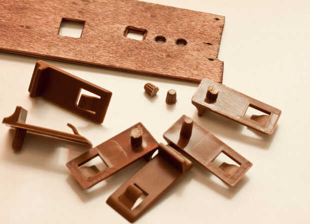 Encontré unos soportes de plástico para estantes con una parte cilíndrica marrón, así que corte y pegado de los botones. También tuve que pegar una arandela de modo que algo de espacio entre la cubierta inferior y el cuerpo de botones.