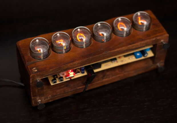 Reloj de nixies de caoba y bronce (con control IR y UART)