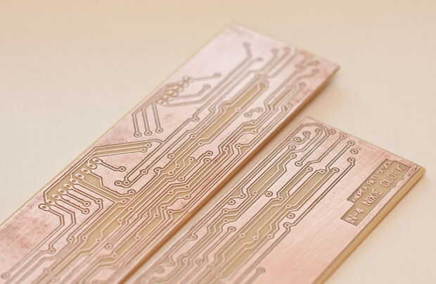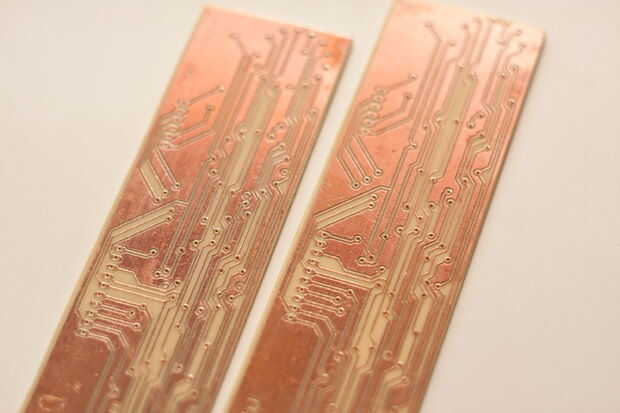 Para construir los tubos escudo el proceso es el mismo que el circuito principal. También en este caso hice dos tablas al mismo tiempo. Ambos salieron bien, excepto cerca de los bordes donde tuve que corregir alguna falta de toner con el marcador permanente.