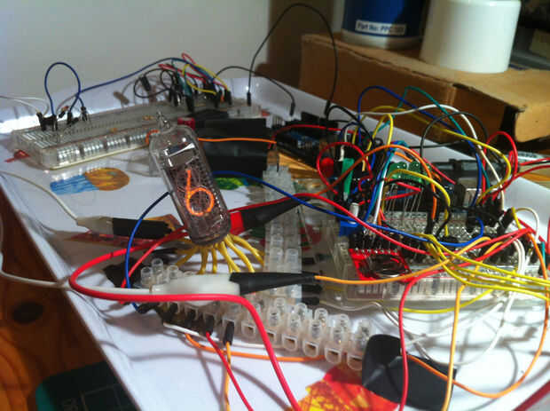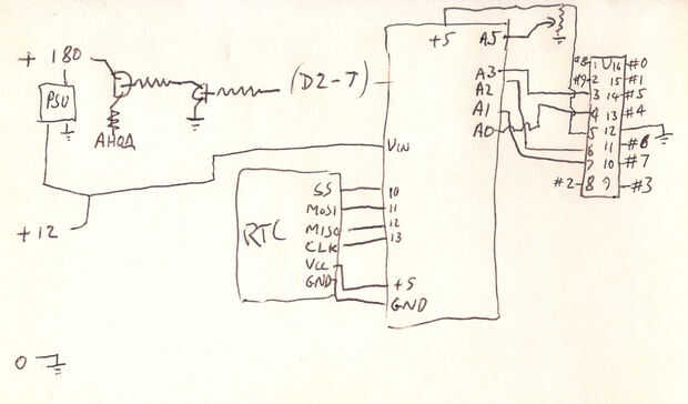 Mi principio básico de diseño es similar a la gente a menudo conduce pequeñas pantallas de LED. Conectar los cátodos de todos los tubos con cátodos de igual números de los otros tubos. Luego cambiar individualmente del ánodo de cada tubo. Al hacerlo que solo me falta controlar 10 cátodos y ánodos de 6. Conectando uno ánodo y el cátodo número correcto puedo hacer cualquier dígito del resplandor. Porque una vez recientemente encendido el encender de los tubos instantáneamente puedo pulso a través de los dígitos rápidamente y brillantemente y persistencia de la visión hace que parezca todos están encendidos a la vez.