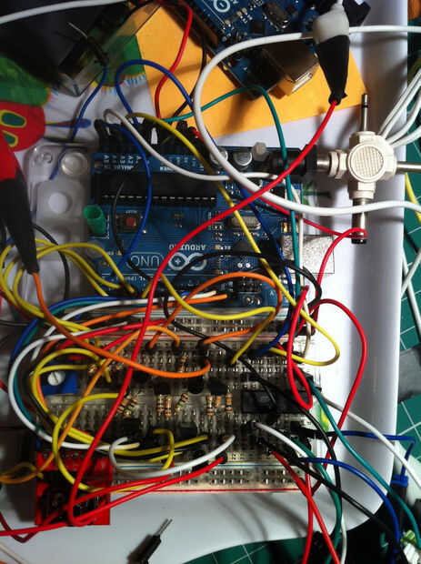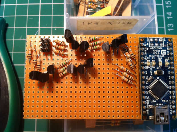 El control del reloj todo se consigue utilizando un Arduino. Inicialmente breadboarded con un UNO, pero me fui para un Nano cuando necesité caber en la caja. Todo fue diseñado para caber el trozo de placa perforada que cortar para caber en la caja. Soldado también abierto hasta el amanecer para prepararse antes de un Maker Faire...