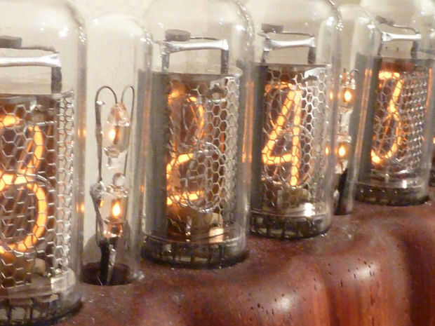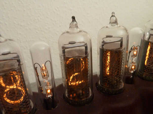 Los dos puntos del reloj están hechos de sub neones de corriente miniatura conectada directamente a la fuente de alimentación. Cada neón tiene su propia resistencia limitante de corriente en serie. Valores de resistencia deben escogerse cuidadosamente para evitar el brillo de los nixies. Las piernas están flexionadas posición estructuralmente las lámparas de neón. Cada conjunto de colon entonces se coloca cuidadosamente en un tubo de ensayo mini para que encajen en el estilo de nixie. Claro detiene sellador de silicona en la apertura deslizante hacia fuera.