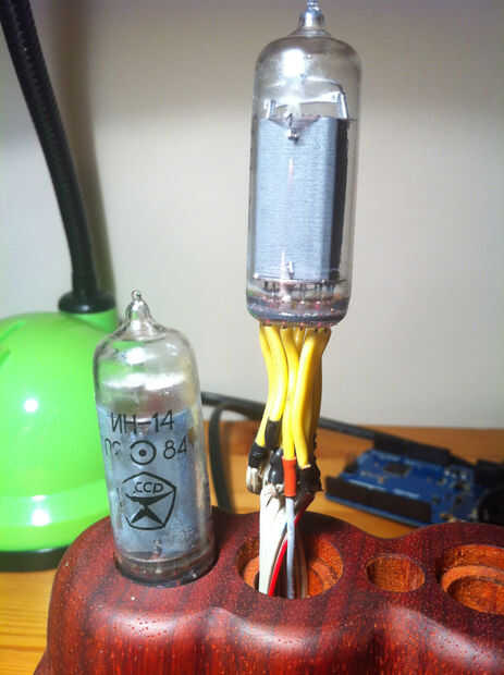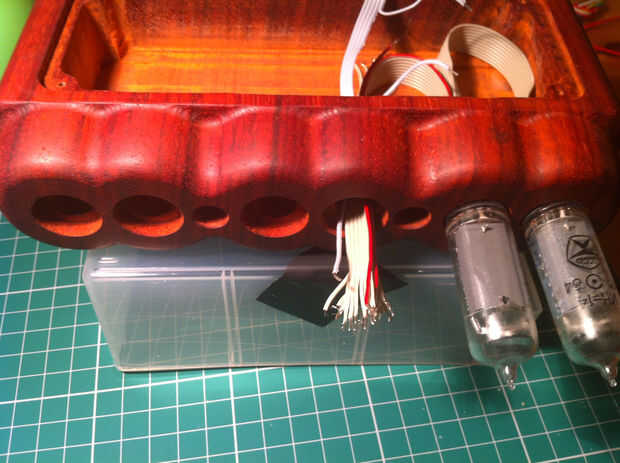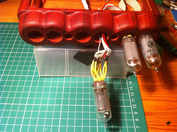 Otra característica de la ИН-14s más barato es el hecho de que tienen vuelo conduce en lugar de sockets. Esto hace difícil montar perfectamente y muy cansino reemplazar. Dicho esto que mina han estado funcionando durante 3 años 24/7 sin ningún problema. El cajeado que he añadido a la base cubre cualquier desorden, pero nada puede evitar la necesidad de hacer 66 incómodo aislamiento Empalmes montar estos nixies de la soldadura.
