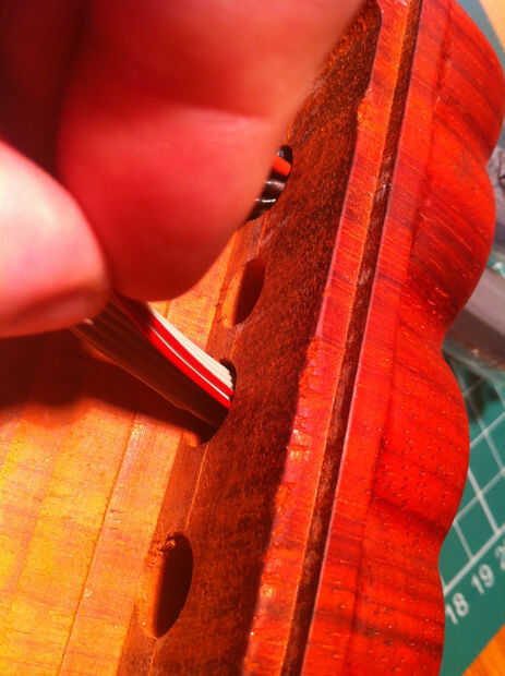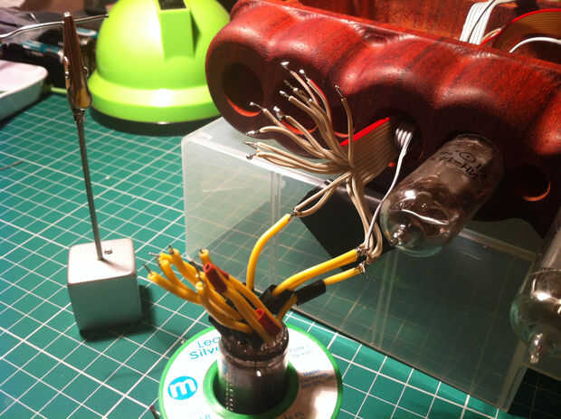El ánodo está conectado a una cinta que se divide en 6 hebras, lo que es agradable y fácil de alimentar a través del agujero en la madera. La cinta del cátodo es mucho más difícil, puesto que hay realmente dos cintas, una del tubo anterior y al siguiente tubo. Éstos tienen que ser doblado para conseguir a través. Cada uno de los empalmes de la soldadura debe hacerse a su vez, empalmar dos alambres en cada cable del cátodo, intentando no olvidar poner un poco de calor retráctil en primer lugar la cinta!