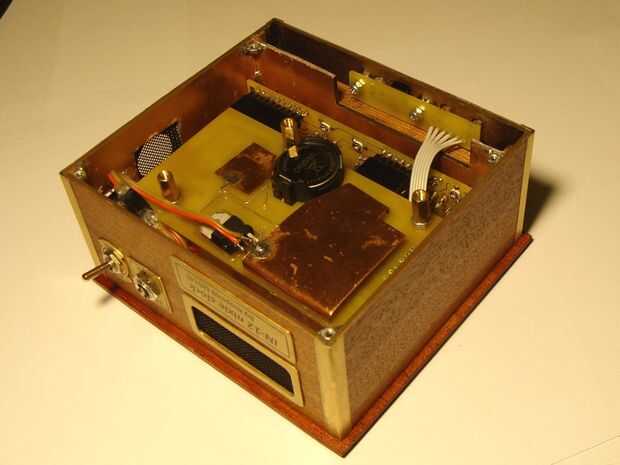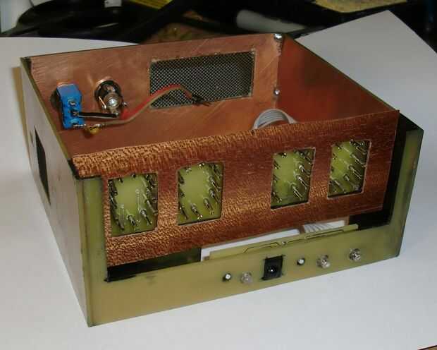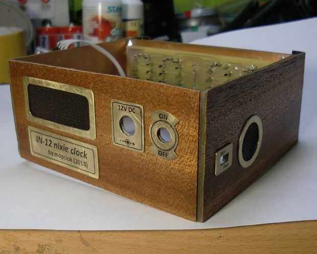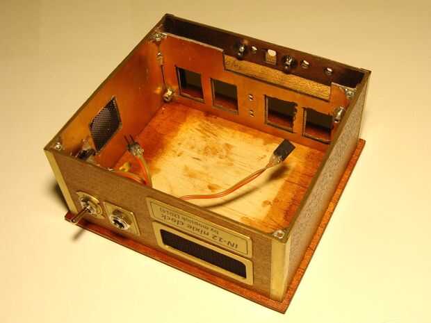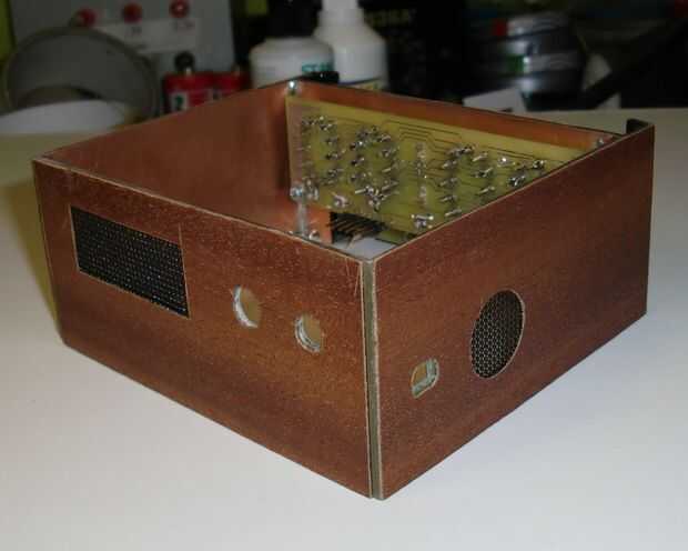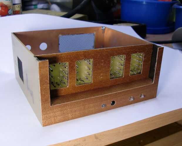 Cuando la madera estaba seca, pegué la pared superior de la carcasa. Luego perforé cuatro agujeros en la pared de fondo (para los tornillos de montaje). Al final añadí las almohadillas antideslizantes y pegado cuatro esquinas de latón para ocultar a las uniones.
