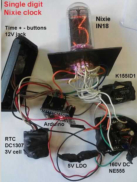 Solo dígito simplifica la tarea de soldadura aburrida como una que Ondina debe conectarse en lugar de 4 o 6. Solo dígito aumentar la dinámica para el reloj y también hace más barato el reloj. Un solo tubo en 18 en E-bay cuesta alrededor de 30 euros Puede utilizarse cualquier otro Nixie que conseguir con el circuito descrito en el archivo adjunto. El código del programa Arduino se une también que funciona con una biblioteca de ArduinoRTC_DS1307.