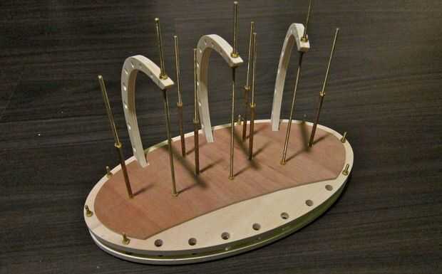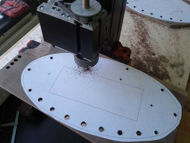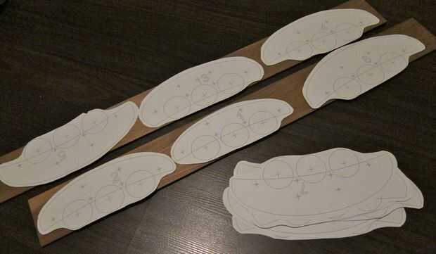 Para la base he comprado madera de nogal y arce. Después de cepillado pegué el print outs de las formas base y perforar todos los agujeros. Mi experiencia para hacer los agujeros primero, luego cortar la forma. Donde los agujeros más grandes están cerca del borde de la broca o fresa podría romper pequeñas virutas de la madera si se corta la forma primera y definitivamente no es una buena cosa. Así después de que tener los orificios de corte los óvalos con mi desplazamiento de la sierra. Para la placa PCB que hice la apertura en todos los componentes de base 3.
