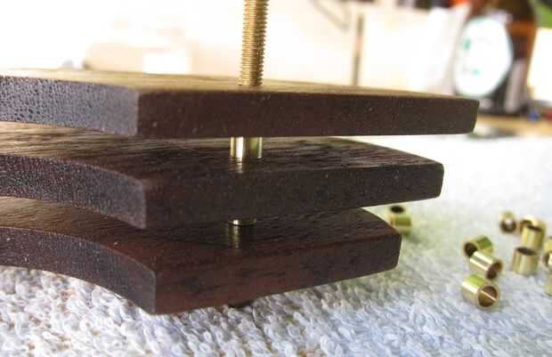 Después de ensamblar todas las piezas el siguiente paso fue lijar con un papel de grano fino. He aplicado algunas mancha oscura en las partes de la nuez, el arce seguía siendo natural y rocía con una laca del metal. Me pareció más duro y resistente que la madera.