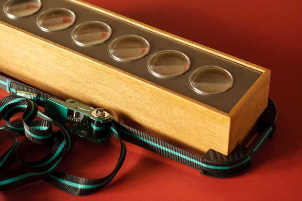 Ahora puede pegar el marco de la causa. Usé pegamento de vinil y una abrazadera de banda útil para mantener las tablas de madera Unidas firmemente entre sí. También pinté el interior del tablero de atrás y los seis soportes de madera por el negro.